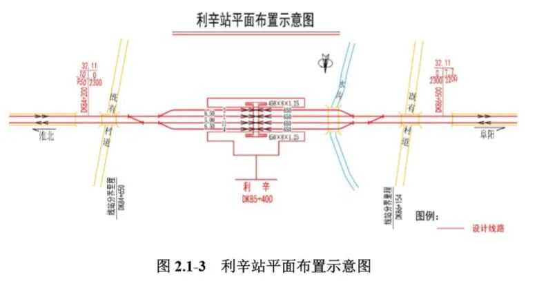 新建利辛站为地面站,东西向布置,位于利辛县县城南侧,苏店新村东南方800m,距县城主城区 4.5km。车站范围内用地主要为旱地,地势平坦,拆迁建筑 物较少。车站中心里程为 DK85+400,站房位于线路右侧,为线侧平式,站坪长 1.50km,为平坡直线。车站设到发线 4 条(含正线 2 条),有效长 650m;基本 站台(450×8×1.25m)和侧式站台(450×8×1.25m)各 1 座,与站台等长雨棚 2 座,进出站旅客地道 1 座(8m 宽)。